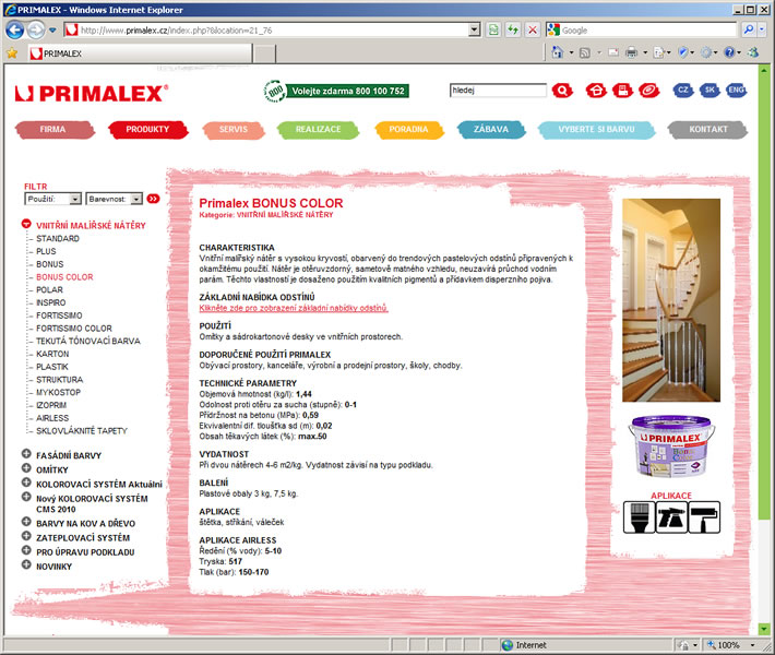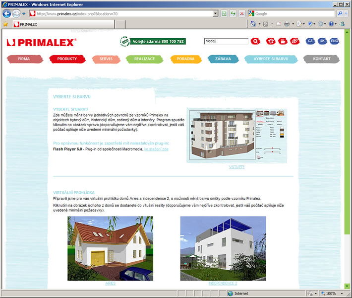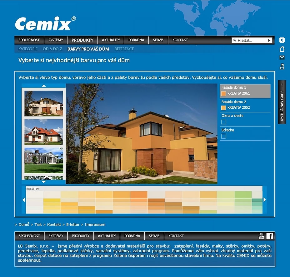 kompletní realizace projektu: komunikace prezentace, webdesign, individuální redakční systém, vytváření spořičů obrazovky. Aplikace Vyberte si barvu umožňující barevně navrhnout fasádu a interiér včetně vlivu osvětlení na odstín barvy.