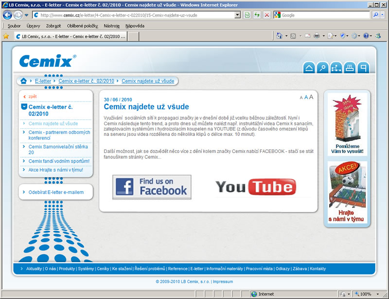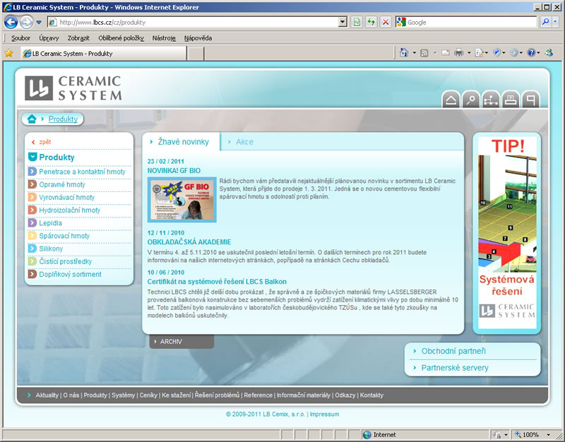 Kompletní řešení internetové prezentace pro společnost LB Cemix. Vytvoření nového systému komunikace, web designu, redakčního systému. Hlavní inovací nové web-site je průvodce výběrem systémů členěných podle typu uživatele.