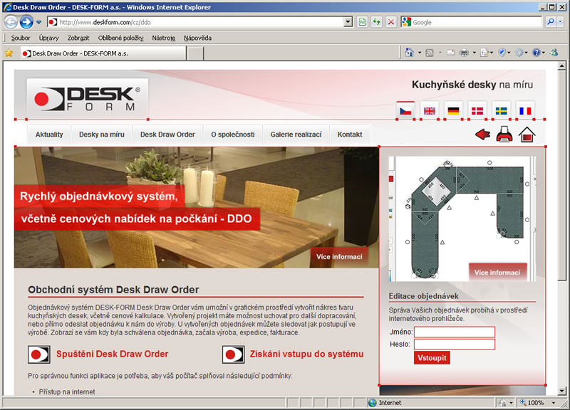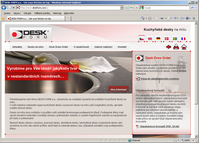 Evropský výrobce kuchyňských desek na míru. Kompletní řešení Internetové prezentace. Návrh komunikace, web designu, redakční části klienta, napojení na objednávkový grafický systém Desk Draw Order.