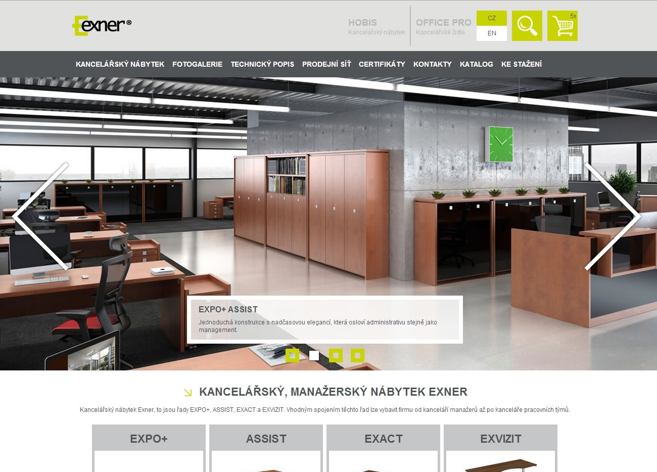 Nová Internetová prezentace značky EXNER – manažerský nábytek, představuje symbiózu technologií dle roku 2014 a osvíceného přístupu klienta-zadavatele. SOFTconsult tímto projektem uzavřel první etapu kompletní vizuální a technologické aktualizace Internetových prezentací značek Hobis, Office Pro a Exner. Značka Exner směřuje na vyšší manažerské klienty, z toho důvodu design a ovládání je navrženo jiným způsobem, než u zbylých dvou značek.