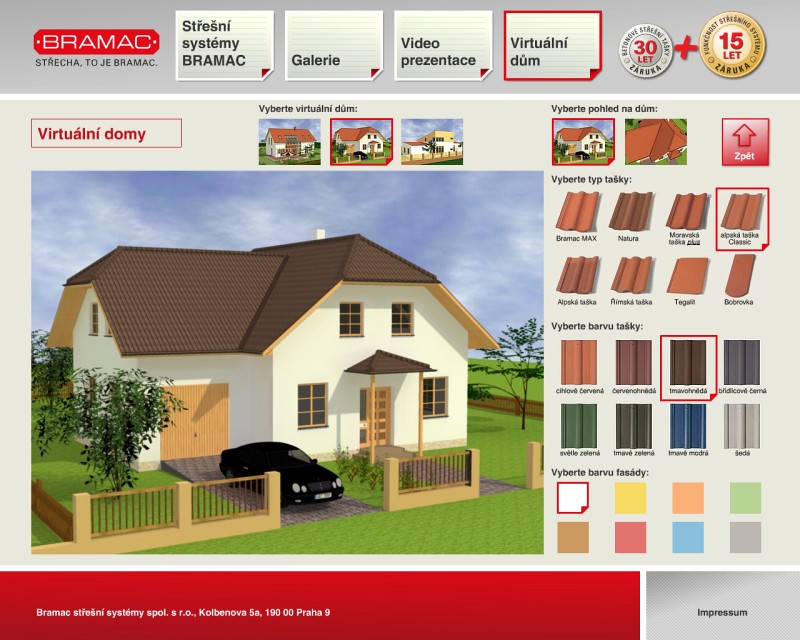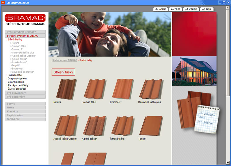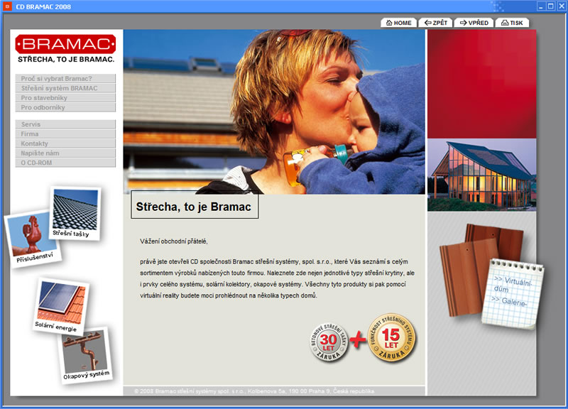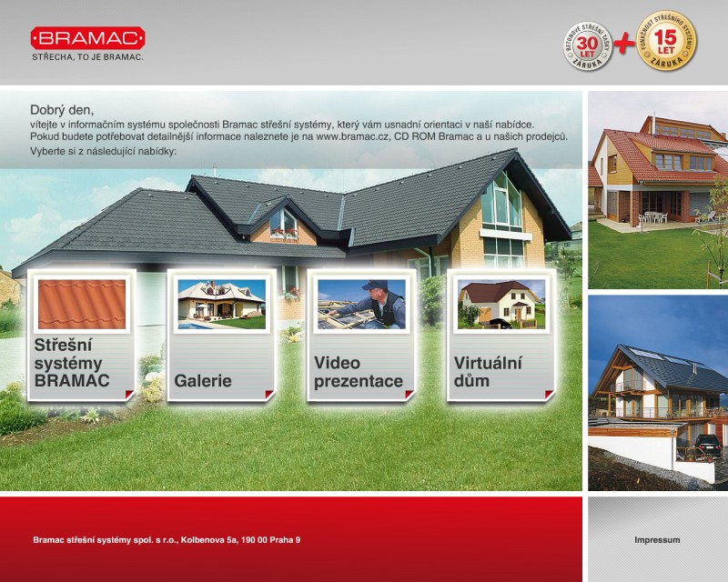 Prezentace střešních systémů Bramac. Kompletně jsme zpracovali celou prezentaci. Zpracování CD zahrnovalo vygenerování přehledu sortimentu z Internetové prezentace a vytvoření speciálního programu na prohlížení obsahu CD. 3D aplikace Virtuální střecha na deseti domech prezentuje sortiment Bramac ve 3D virtuální realitě, kdy lze kolem domů procházet a zároveň měnit typy a berevnost střešních tašek i fasád domů. Součástí projektu bylo i vytvoření programu na Statické posouzení krokví.