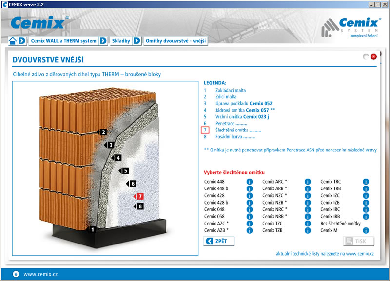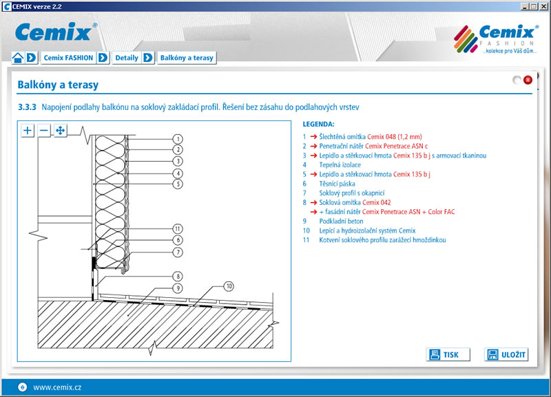 Prezentace stavebních hmot a konstrukčních řešení. Realizovali jsme kompletní projekt: koncepci CD, design a speciální aplikace. Pro projektanty jsme vytvořili aplikaci na prohlížení technických detailů s doplněním výrobků z nabídky Cemix a vygenerováním do DXF. Aplikace Barevné řešení fasády na vybraných budovách simuluje použití barev ze vzorníku Cemix.