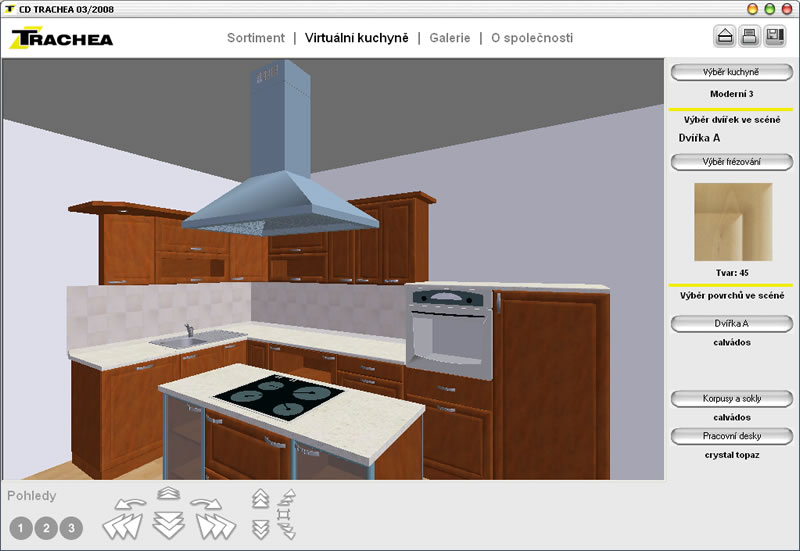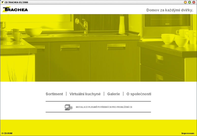 Prezentace kuchyňských dvířek Trachea. CD obsahuje přehled sortimentu z Internetových stránek včetně aplikace Konfigurátor dvířek. Na CD je speciální aplikace Virtuální kuchyň v rámci které na vybraných sestavách kuchyní uživatel provádí výměny frézování dvířek a barevnosti.